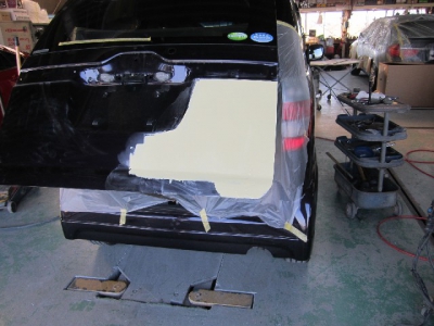 ゼストのバックドア修理 引き出し作業が終了しパテ作業で成型します 下地塗装して さらに下地を600番の水研ぎペパーで研磨し 上塗りし 取り外した部品を取り付けし作業終了です